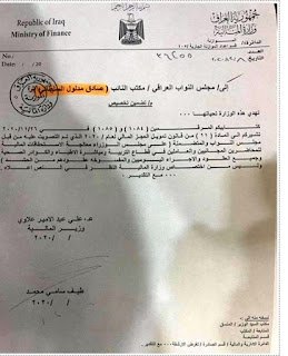 حصلت اخبار العراق،على وثيقة صادرة من وزارة المالية ترد فيها على النائب صادق مدلول السلطاني، بشأن مستحقات المحاضرين المجانيين والعاملين في قطاع التربية ومباشرة الاطباء والكوادر الصحية وجميع العقود والاجراء اليوميين والمفسوخة عقودهم من الحشد.
