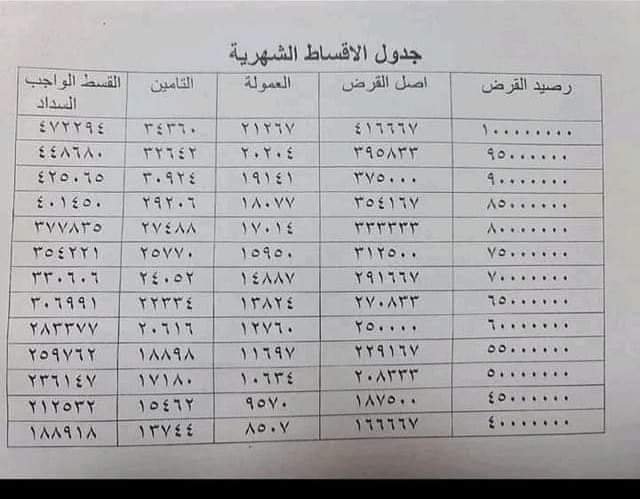 ٧- مبلغ القرض لا يزيد عن ١٠٠ مليون ومبلغ القسط الشهري هو 472 ألف دينار عدا الفائده.