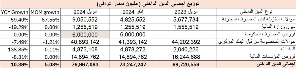 وبحسب الإحصائية التي نشرها رئيس مؤسسة عراق المستقبل للبحوث والاستشارة الاقتصادية منار العبيدي، فان اجمالي الدين الداخلي في ابريل/نيسان 2024 ارتفاع ليبلغ 76.9 ترليون دينار، مرتفعا عن شهر اذار/مارس 2024 بنسبة 5% اذ كان اجمال الدين الداخلي للعراق 73.2 ترليون دينار عراقي ومرتفعا عن ابريل/نيسان 2023 بنسبة 10.39% اذ كان اجمالي الدين الداخلي في وقتها 69.7 ترليون دينار عراقي.