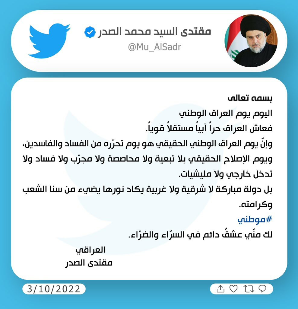 وقال الصدر في تغريدة اطلعت عليها اخبار العراق، “اليوم يوم العراق الوطني فعاش العراق حراً أبياً مستقلاً قوياً، وإن يوم العراق الوطني الحقيقي هو يوم تحرره من الفساد والفاسدين ويوم الإصلاح الحقيقي بلا تبعية ولا محاصصة ولا مجرب ولا فساد ولا تدخل خارجي ولا مليشيات”.
