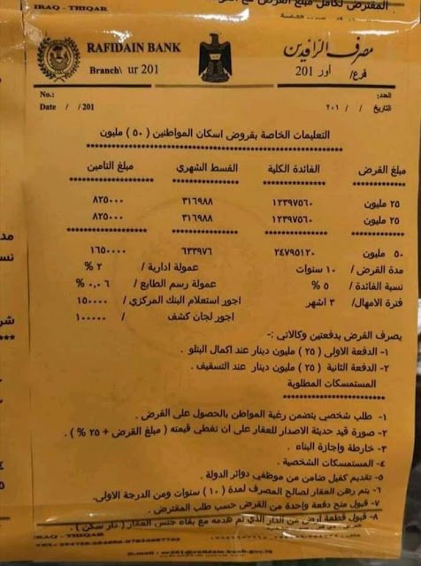 اعلن مصرف الرافدين اليوم السبت الموافق 27/2/2021 ,المباشرة بتوزيع قروض الاسكان للموظفين والمتقاعدين وجميع المواطنين ,واشترط علي العاطلين ان يضمنهم كفيل من موظفي دوائر الدولة .