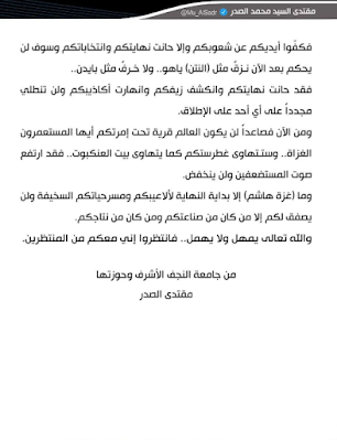 وطالب السيد الصدر الحكومات الغربية بـ”كف اياديهم عن شعوبهم”، محذرا ان “نهايتكم باتت قريبة”.