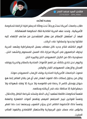 ساند زعيم التيار الصدري السيد مقتدى الصدر، موقف طلبة الجامعات الامريكية المنتفضة والمطالبة بوقف العدوان على غزة، وذلك بعدما تم اعتقال 550 شخصا بين طلاب وأساتذة.