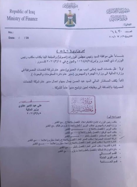 وأوضحت وثيقة موقعة من وزير المالية أن القرار جاء بناء على موافقة رئيس مجلس الوزراء مصطفى الكاظمي والتي جاء فيها نقل مثنى اديب الى وزارة الهجرة والمهجرين بمنصب مدير عام دائرة المعلومات والبحوث وتكليف المستشار المالي عبد الحسن جمال بمهام اعمال مدير عام شركة الخدمات المصرفية بالإضافة لوظيفته لحين ترشيح مديرا عاما جديدا للشركة.